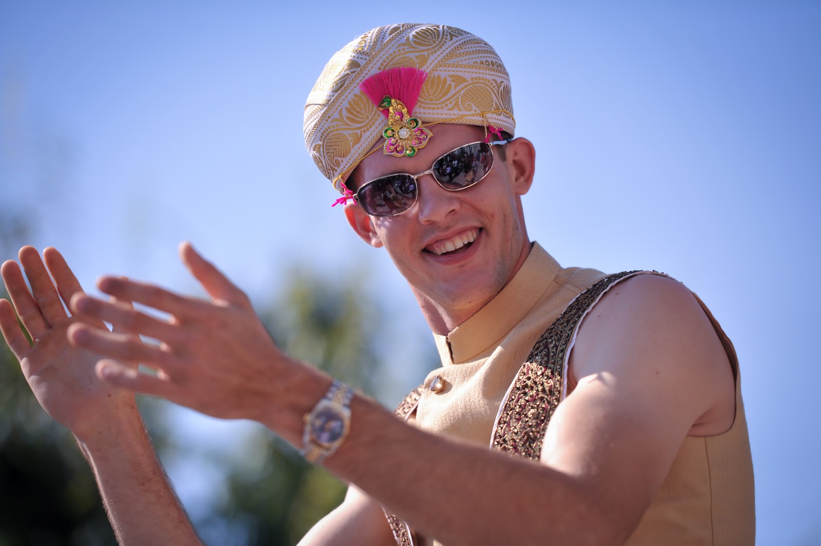 The groom, along with the barati, which consist of his family and friends, are accompanied by the DJs playing the music in their cool barat-mobiles! Dholis typically escort them, playing the dhol or tasa – my absolute favorite. Amazing how the barat dances in a coordinated way in the middle of the day in the scorching heat. You have to see it to believe it. One of our most memorable member of a barati was surely Jassi‘s 99-year old grandfather! We can never forget him dancing joyfully at his grandson’s barat at the Bridgewater Gurdwara and Nicholas‘s very American Grand Mother dressed in Indian attire dancing at the Barat. The Barat photos of PhotosMadeEz are never complete without the Bridesmaids and the Groomsmen dancing. And of course we never forget to take her bride peeking or throwing kisses at her Knight in Shining Armor.